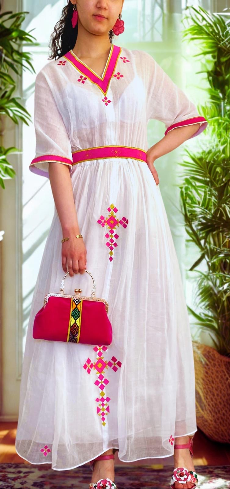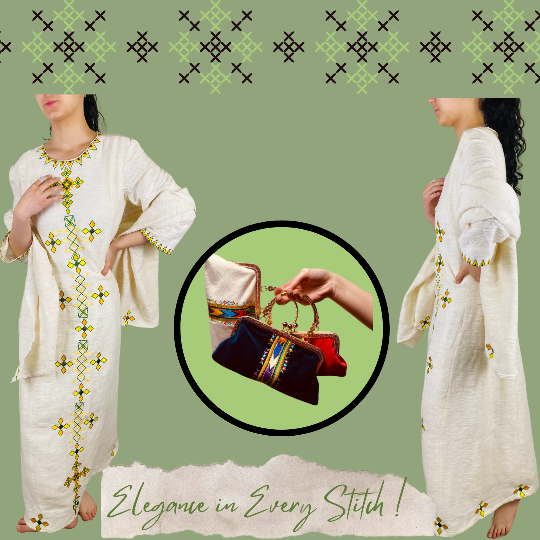 The elegance of the Habesha Kemis, (Habesha Libs) a traditional Ethiopian and Eritrean dress made from white cotton fabric, often adorned with intricate embroidery. Perfect for formal events , Church and cultural celebrations."Shop authentic styles today!