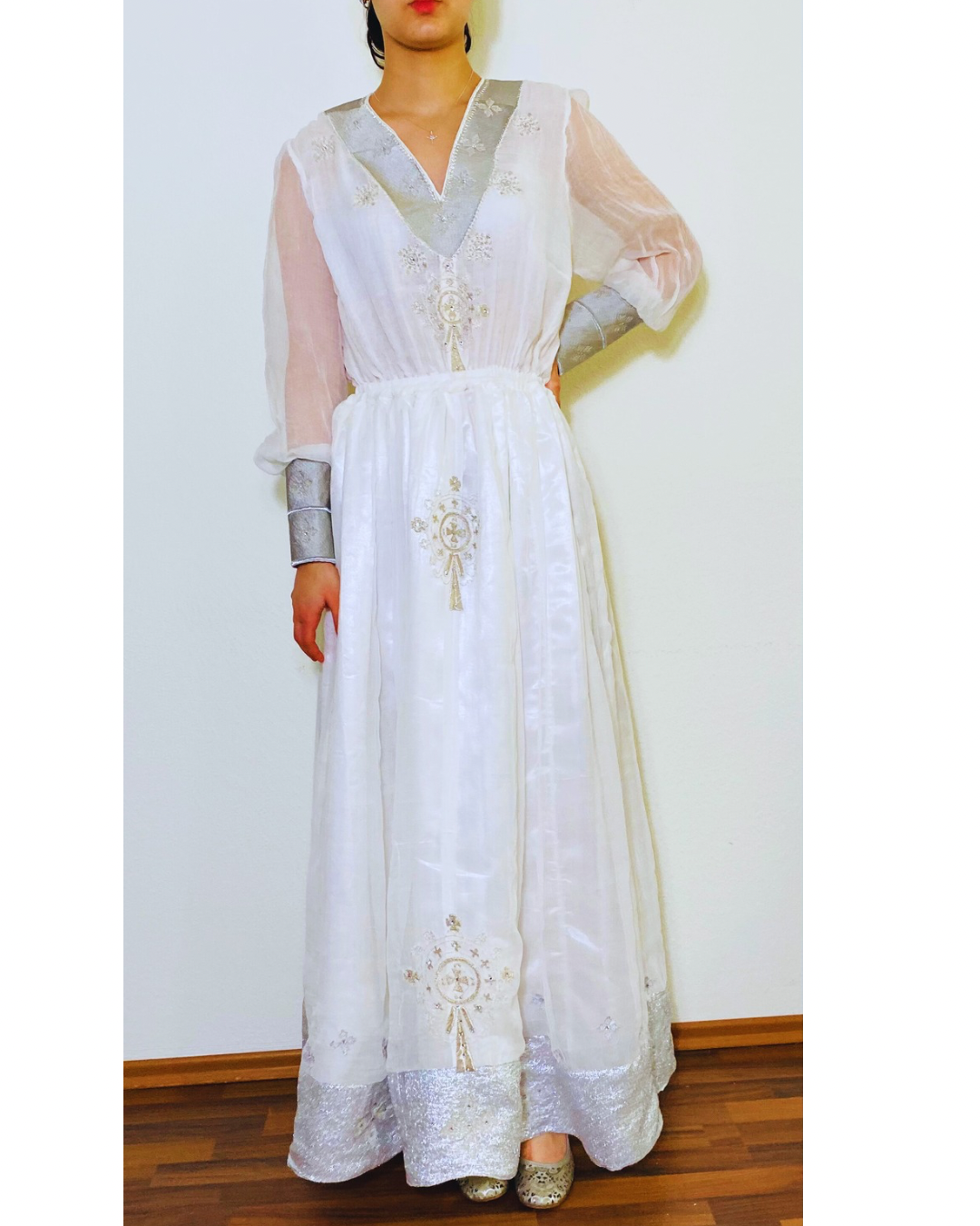 The stunning Ethiopian Eritrean Habesha Kemis (ሀበሻ ቀሚስ ለቁርባን ለቤተክርስቲያን) is crafted from hand-woven Ethiopian cotton fabric known as MENEN (መነን ጨርቅ). It is embroidered with silver metallic thread around the neckline and complemented by silver cross motifs, with the two larger crosses also adorned with silver thread. The underskirt is made from luxurious satin material. A large scarf (ነጠላ) accompanies the dress, bordered with beautifully embroidered small crosses that harmonize with the overall design. This dress is designed to flatter every figure elegantly.