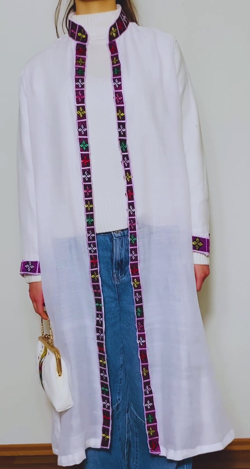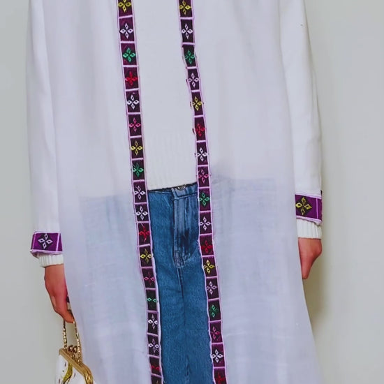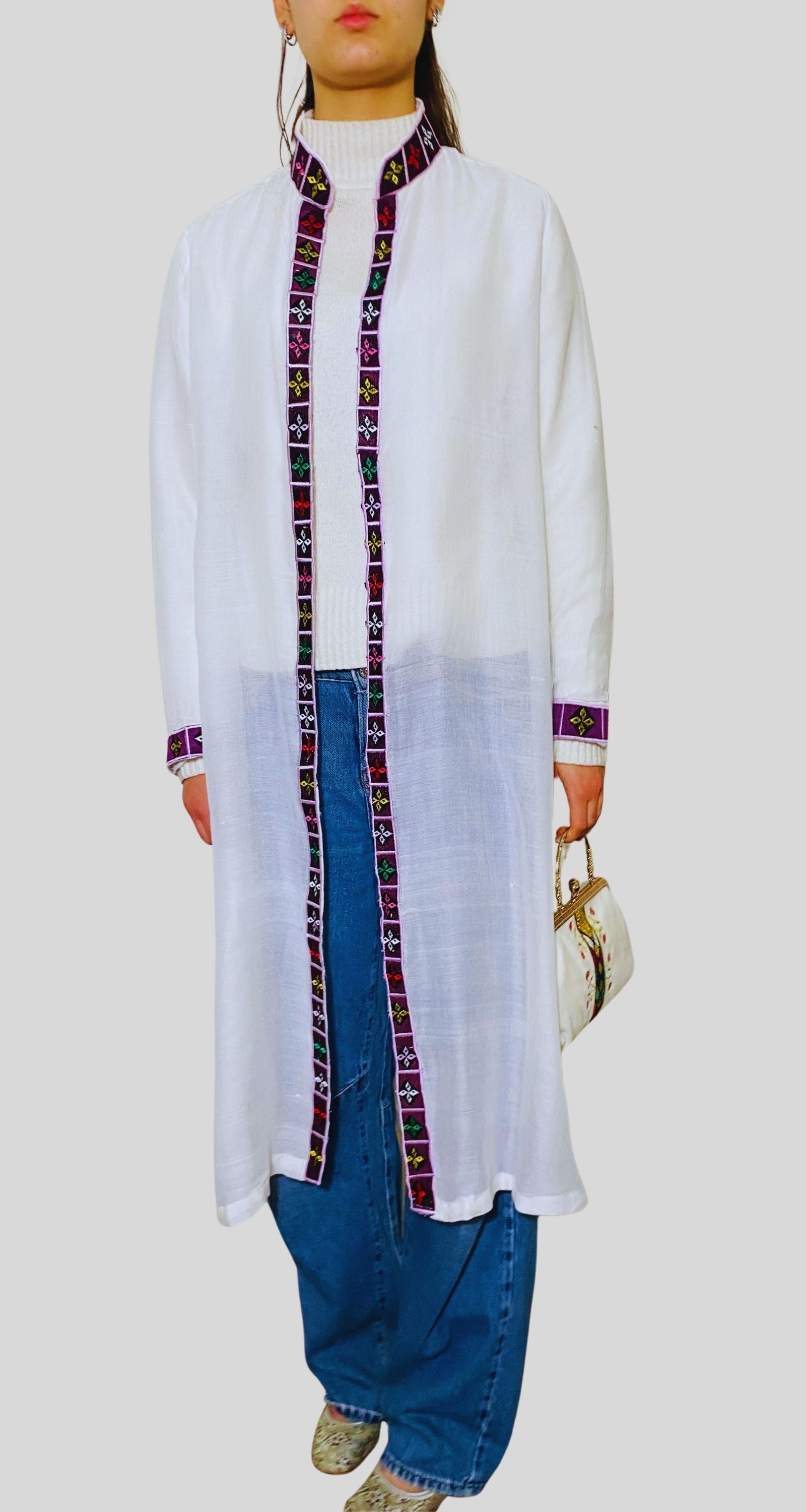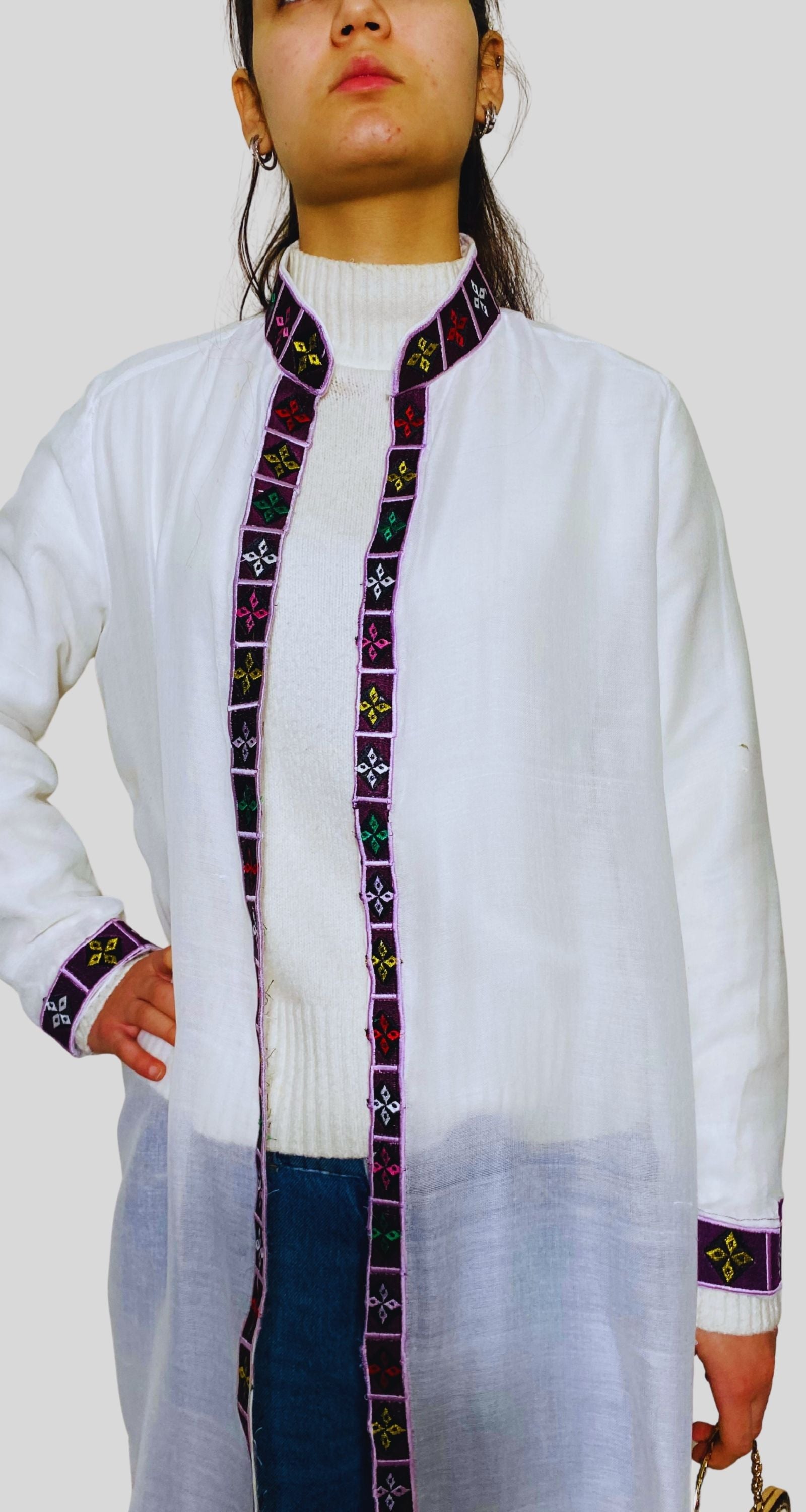 Long blouse made from Menen (መነን)fabric, handcrafted and embroidered with multiple beautiful colors. This blouse is long and flatters every figure, enhancing any outfit.