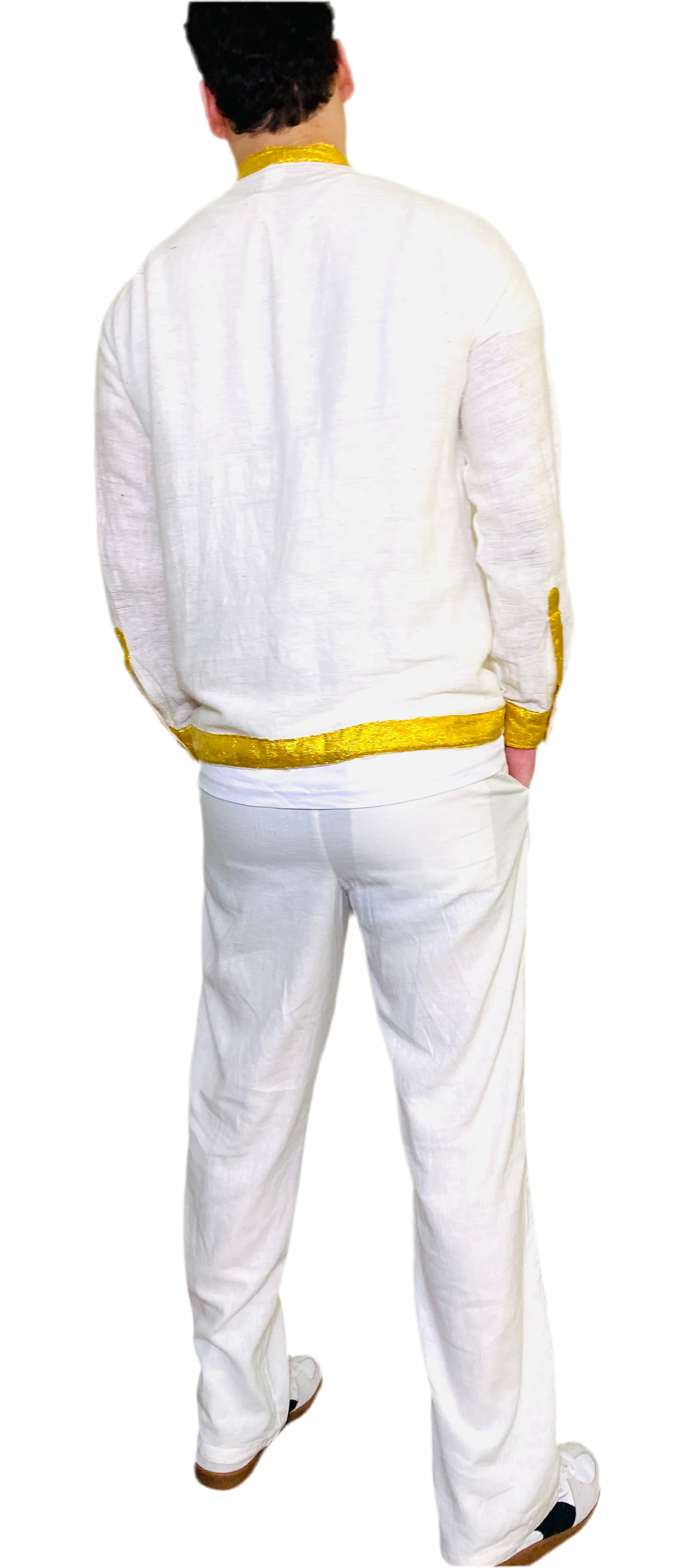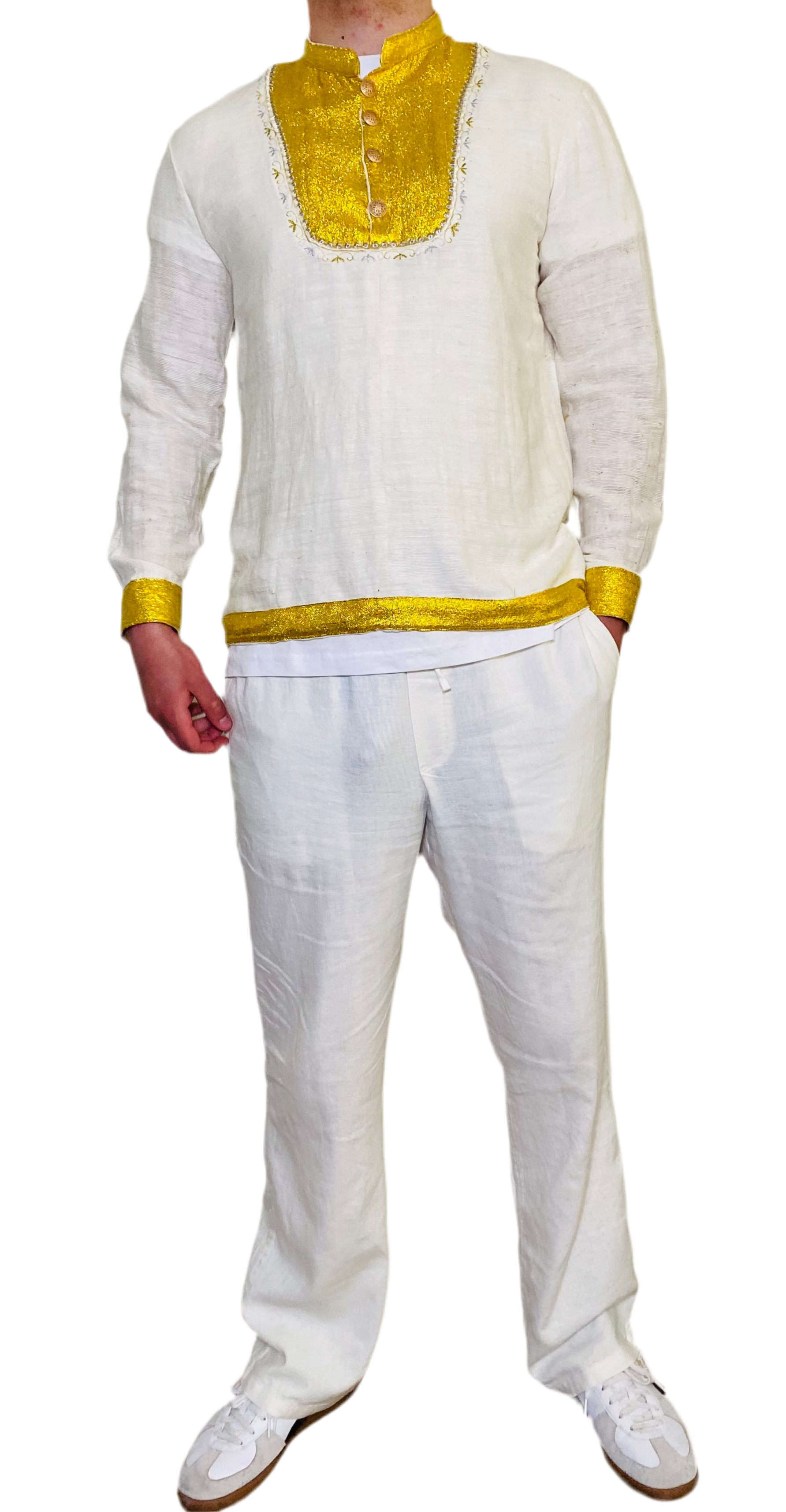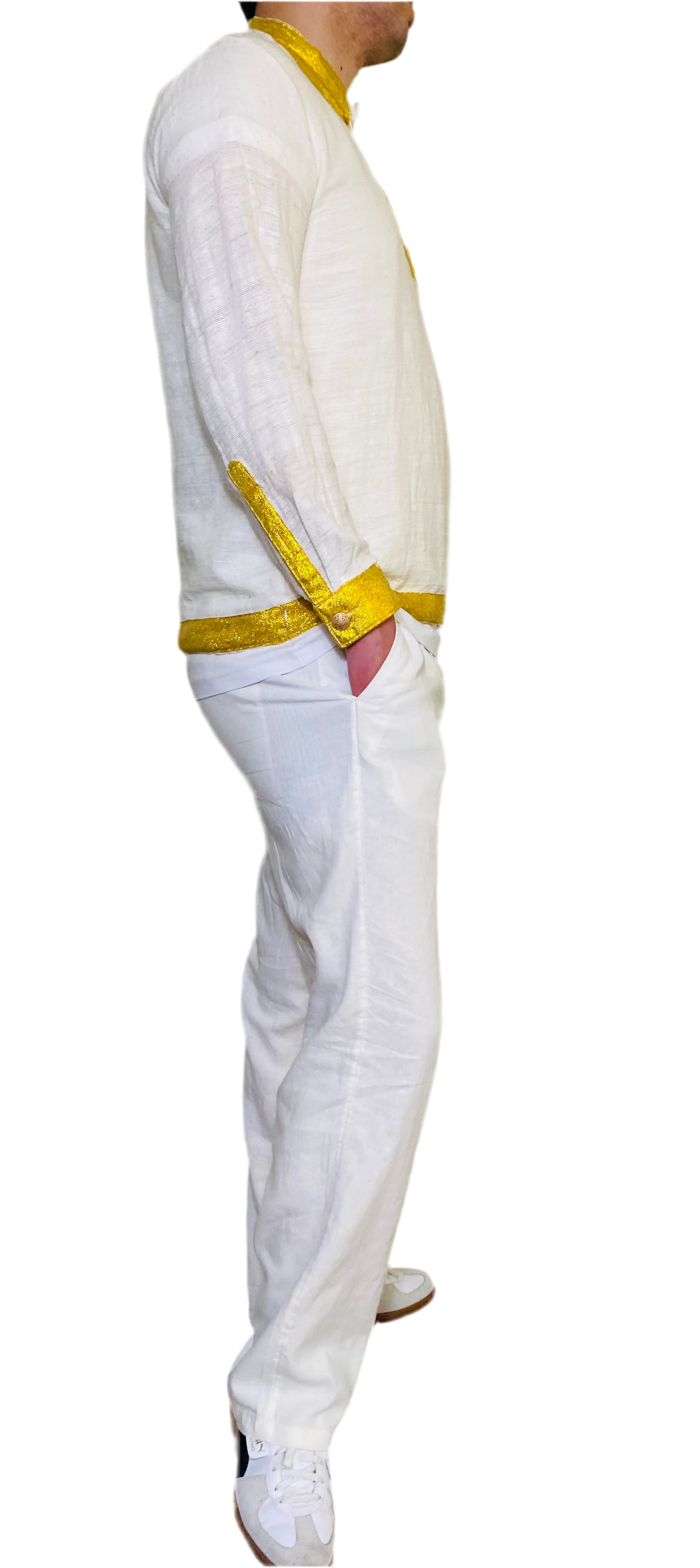 The long-sleeve Fetel shirt (ፈትል) is crafted from hand-woven 100% cotton fabric sourced from Ethiopia. The collar, chest, and sleeves are adorned with intricately woven gold TILET (ጥለት). Additionally, the shirt features delicate embroidery of small flowers and leaves in gold and silver metallic threads. Not only is this shirt exceptionally comfortable, but it also elegance.